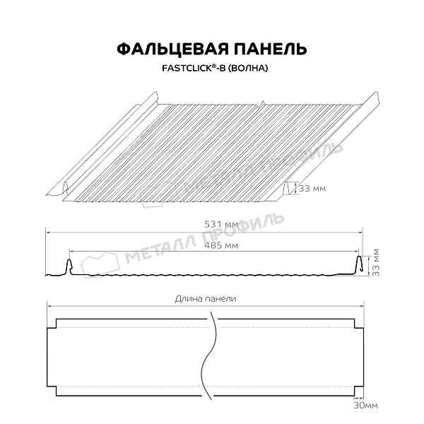 - Фальцевая панель Металл Профиль FASTCLICK-В (VALORI-20-Violet-0.5) изготовлена из оцинкованной стали с полимерным покрытием VALORI®. Оно защищает изделие от влаги и предотвращает коррозию.