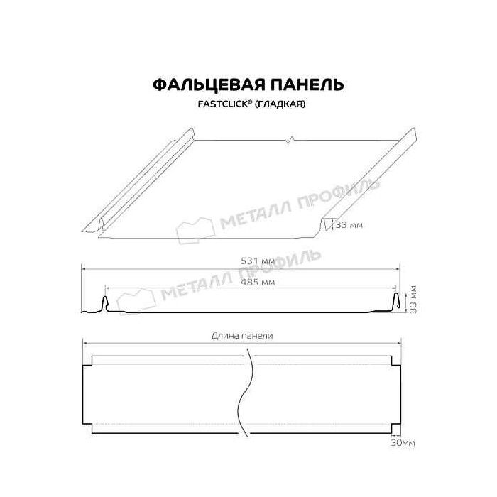 Что касается габаритов, то Фальцевая панель Металл Профиль FASTCLICK (VikingMP E-20-8017-0.5) обладает удобными параметрами: лёгкую картину шириной 531 мм просто монтировать, а замки высотой 33 мм обеспечивают надёжное и герметичное соединение. Длину панели можно подобрать, она варьируется от 0,5 до 12 метров.