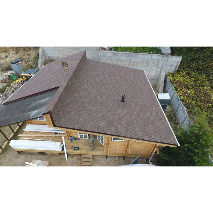 Натуральные коричневые оттенки черепицы хорошо сочетаются с фасадами в сливочных и светло-зеленых тонах. Лепестки лаконичной формы не отвлекают внимание от деталей кровли. Благородный матовый блеск гранулята подчеркивает класс материала.