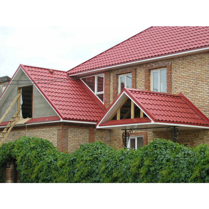 • Кровля защищена от механических воздействий, так как в основе металлочерепицы сталь толщиной 0.45 мм (с учётом металла, цинкового и полимерного слоя).