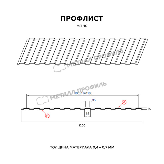 МП-10 – разновидность типичного стенового профнастила. Он замечательно смотрится в виде стенового материала, подвесного потолка в нежилых помещениях, вентилируемого фасада, забора, декоративного ограждения. МП-10 отличается трапециевидной формой волны, аналогичной на сторонах А и В. Глубина волны – 10 мм, это не придаёт металлопрокату высокой способности выдерживать большие нагрузки, но при обшивке фасадов это не самое главное. Но зато спокойный рельеф поверхности не придаёт постройке суровый вид. На прочностные качества можно повлиять, заказав различную толщину стройматериала. МП-10 изготавливается в вариациях от 0,4 до 0,7 мм. Усилить антикоррозионную защиту позволит верхний полимерный слой. Он не только отличается насыщенным цветом, устойчивым к выгоранию под УФ-лучами, но и предотвратит небольшие механические повреждения и ржавение металла.