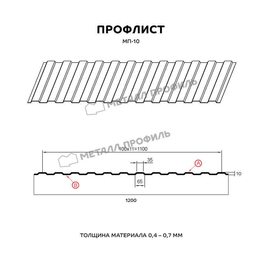 МП-10 – разновидность стандартного стенового профлиста. Он замечательно смотрится в виде забора, декоративного ограждения, подвесного потолка в нежилых помещениях, стенового материала, вентилируемого фасада. Профиль отличается трапециевидной формой гребня, одинаковой с двух сторон. Глубина трапеции – 10 мм, это не даёт металлопрокату высокой несущей способности, но при облицовке стен это не столь важно. В то же время спокойный рельеф профилированного листа не создаёт строению суровый облик. На прочностные характеристики можно повлиять, выбрав различную толщину стали. Данный профиль изготавливается в версиях от 0,4 до 0,7 мм. Усилить антикоррозионную защиту позволит финишный полимерный слой. Он не только обладает богатым цветом, стойким к выгоранию под УФ-лучами, но и предотвратит небольшие механические дефекты и корродирование стальной основы.